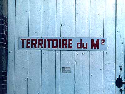 L'accés principal du Territoire s'effectue par un portail monumental équipé d'une serrure mécanique de type artisanal concue et réalisée par Monsieur Georges Dubois ferblantier à Anserville ( Oise ). Le protocole en vigueur veut que ce soit toujours le Président-Artiste qui recoive en personnes ses hôtes sur le pas de la porte où il les raccompagnera à leur départ. Les noms et la qualité du visiteur sont toujours énoncés à haute et intelligible voix par le concierge, quand il est là . Cette formalité constitue une sécurité minimum: un systéme de reconnaissance vocale permettant sur le champ de confondre les clones indésirables qui voudraient pour des raisons inavouables s'introduire dans les lieux et se faire passer pour ce qu'il ne sont pas en réalité...Ce qui risque d'arriver, de plus en plus souvent, compte tenu des mutations que nous vivons avec la RV. Pour pallier à toute éventualité le Territoire dispose d'un dispositif supplémentaire de sécurité, inviolable, de trois "chiens- renifleurs" bricolés par Monsieur Dubois ferblantier à Anserville (Oise).