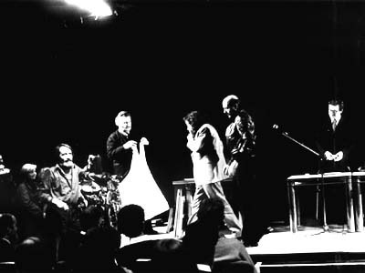 Démonstration du" métre carré pliable" à l'Espace Cardin en présence de deux expert de l'art contemporain : Pierre Restany et Maître Jean-Claude Binoche qui encadrent le Président-Artiste.
