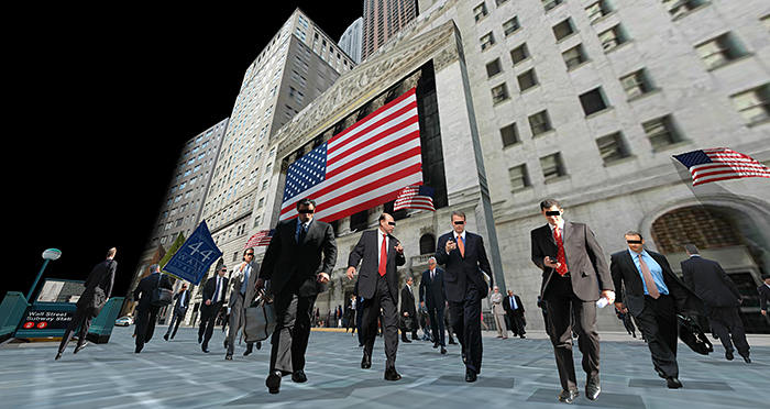 INSTALLATION REALISEE PAR FRED FOREST A NEW YORK EN 2010, METTANT EN OEUVRE A LA LAB GALLERY UNE UTILISATION DE MANNEQUINS DANS UN DECOR SIMULANT WALL-SREET, PLUS UN SITE INTERACITIF SUR SECOND LIFE, PLUS LA PRESENCE DE DEUX RAPPEURS VEDETTES FAISANT DANSER LES PASSANTS DE LA RUE SUR UNE MUSIQUE ORIGINALE. |