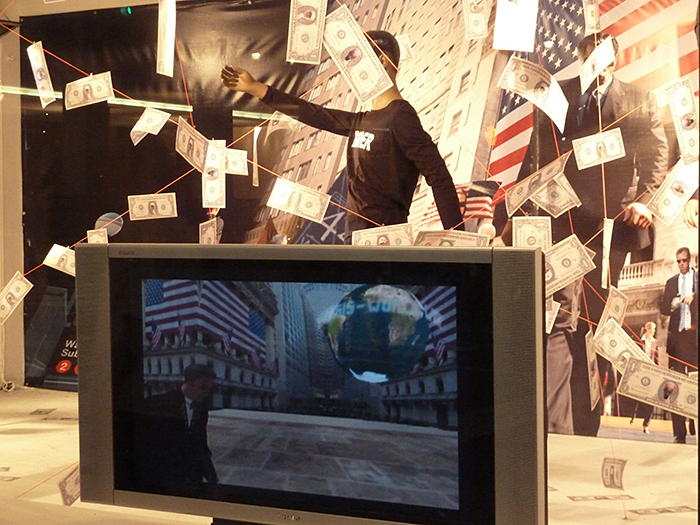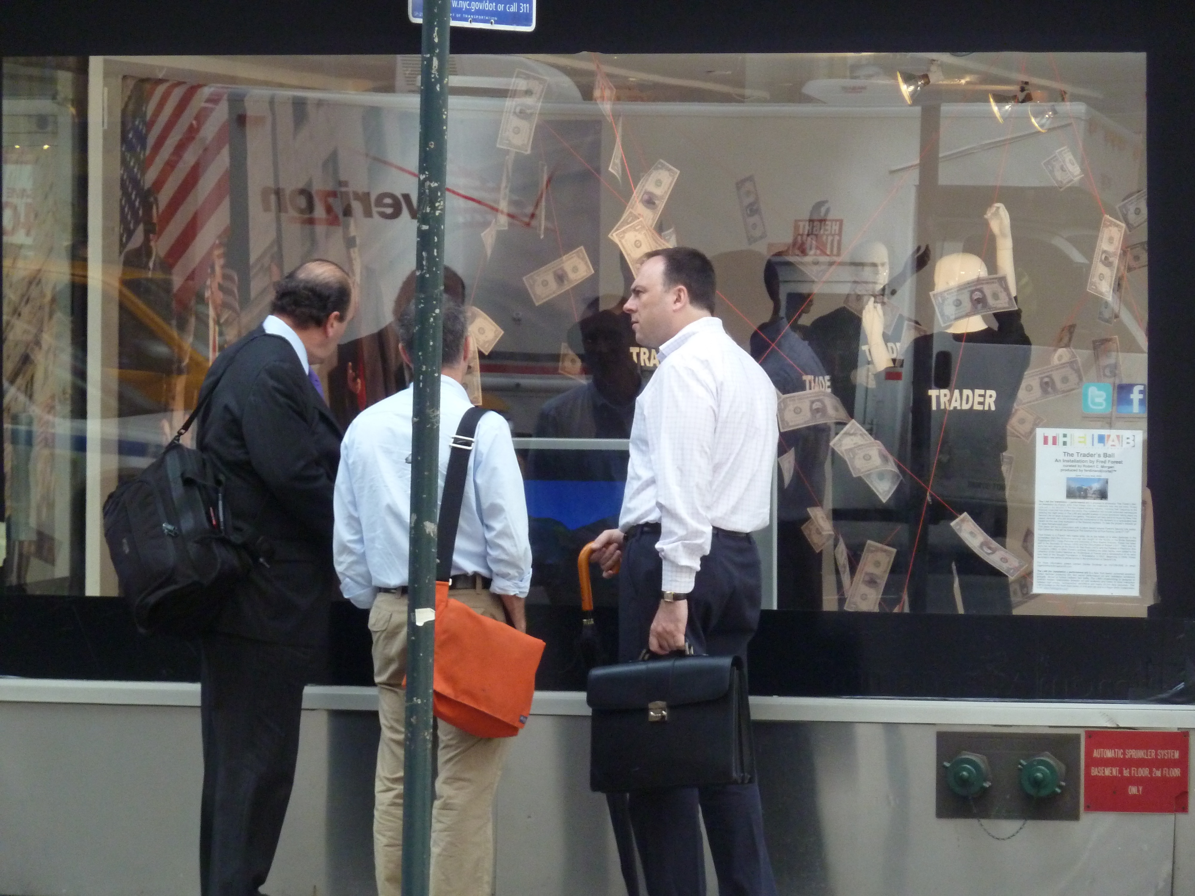 INSTALLATION REALISEE PAR FRED FOREST A NEW YORK EN 2010, METTANT EN OEUVRE A LA LAB GALLERY UNE UTILISATION DE MANNEQUINS DANS UN DECOR SIMULANT WALL-SREET, PLUS UN SITE INTERACITIF SUR SECOND LIFE, PLUS LA PRESENCE DE DEUX RAPPEURS VEDETTES FAISANT DANSER LES PASSANTS DE LA RUE SUR UNE MUSIQUE ORIGINALE. |